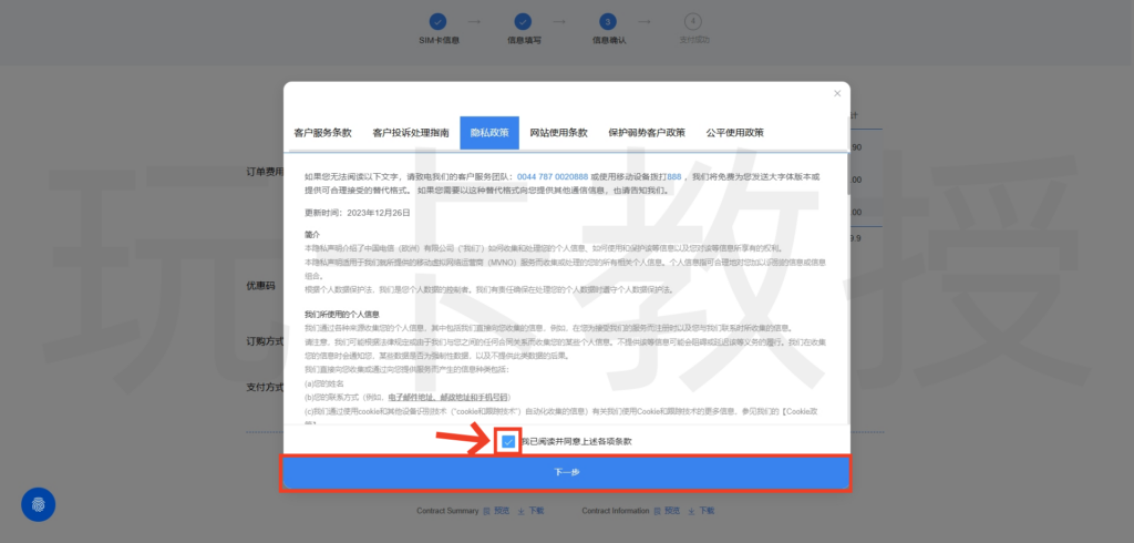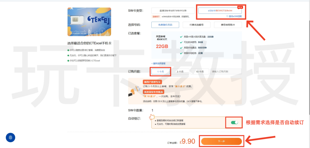 选择eSIM卡,订购月数:根据自己需求选择,自动续订:根据自己需求是否开启,点击:下一步