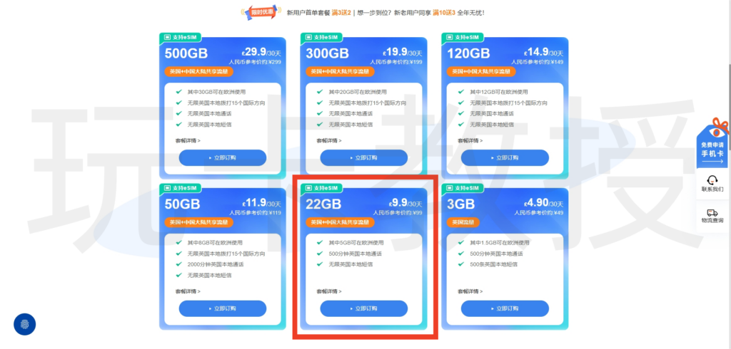 亮点流量套餐:可选9.9英镑/30天,中英共享流量22G套餐,11.9英镑/30天,中英共享流量50G套餐