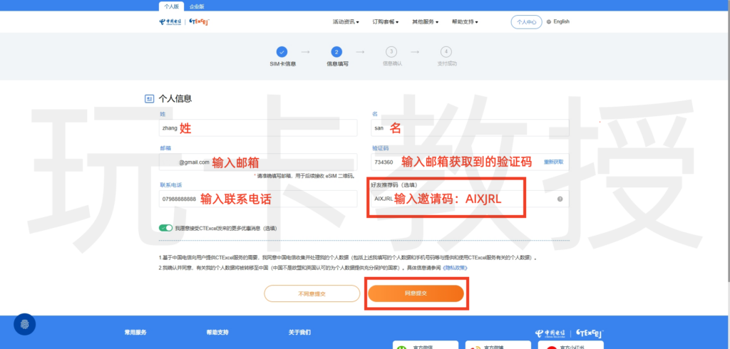 填写姓,名,海外邮箱(用于接收eSIM二维码)联系电话:可以输入你giffgaff的电话,输入推荐码:AIXJRL,购买后你我会获得8英镑话费余额的奖励,点击:同意提交